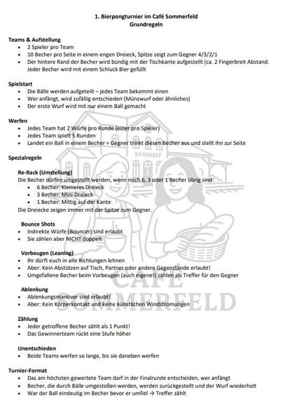 Anmeldungen zum Bierpong bitte hier: Wir spielen in 2er Teams und nach offiziellen Regeln (zeitlich bzw. wurftechnisch verkürzt), welche ausgehängt sein werden. Heißt jede Mannschaft besteht aus 2 Personen und alle Geschlechter können teilnehmen! Ansonsten ist die Teilnahme ab einem Alter von 16 Jahren erlaubt. Teilnahmegebühr pro Team 4,50 Euro. Zu bezahlen am Tag des Turniers vor Ort.